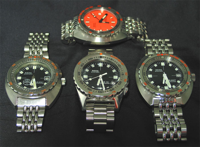 This review is more of a pictorial essay as I have already done an extensive review of the SUB 600T. I managed to get most of the Doxa Sharkhunter editions together at the one time. The photo above shows the vintage SUB 300T, the SUB 250 and the new SUB 600T (I added the orange 600T Professional in the background as a bit of colour relief). Missing from the set is the SUB 300T Reissue. Interestingly enough, of the 1,000 pieces produced, very few of them come up for sale. There is far more secondhand traffic in the orange dial Doxas.