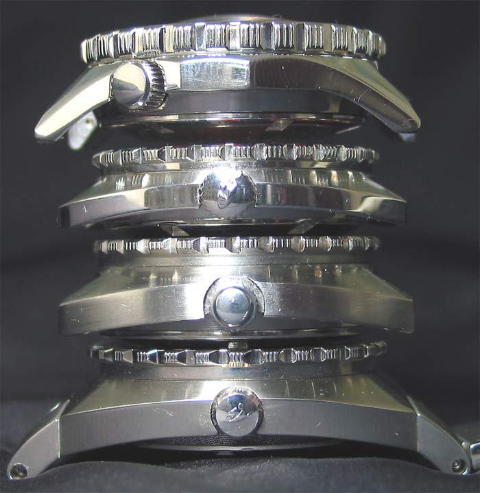 The above photo clearly illustrates the similarity in case shape between the vintage SUB 300T (second from bottom) and new SUB 600T and how completely different they are from the SUB 250 (top case). Note also how the winding crown on the SUB 250 is placed at 4 o'clock rather than the more traditional 3 o'clock position. The photo also shows how much higher the 250 dome is over the slightly domed 600T and flat crystal of the vintage 300T. The bottom case shows just how different the SUB 300T reissue was to the vintage 300Ts.